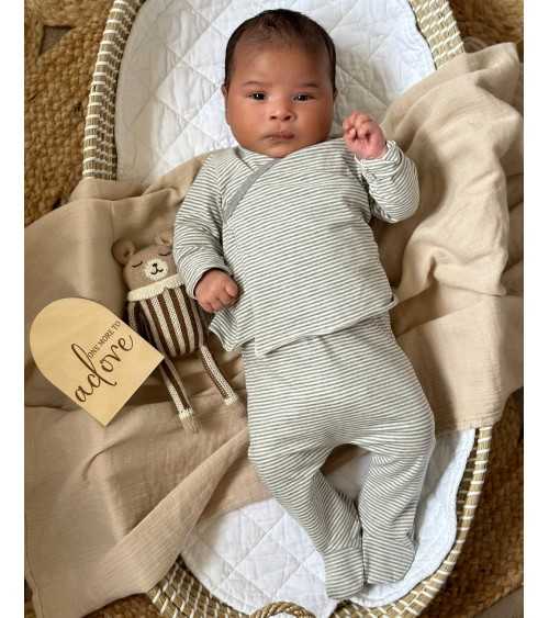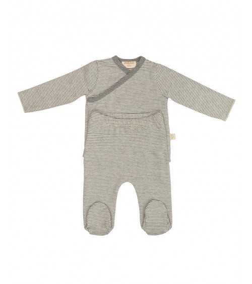 Conjunto Cinza dos Piezas en rayas Grises. Este Conjunto Cinza Algodón Orgánico está formado por una camiseta cruzada con cuello reforzado en rib, manga larga y cierre con botones de presión y por una polaina con cinturilla elástica.