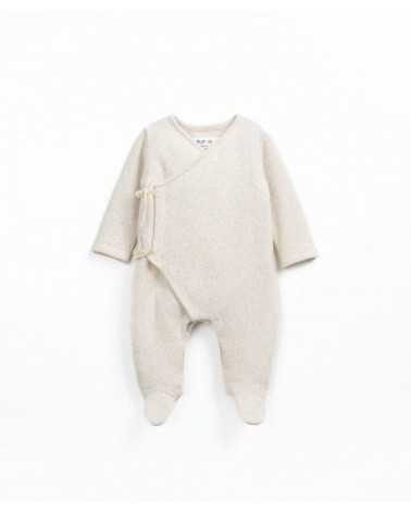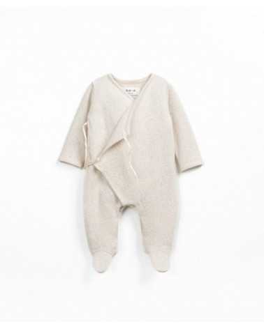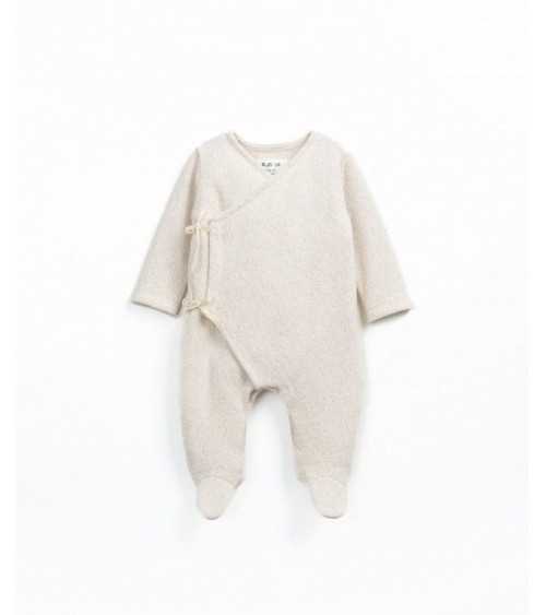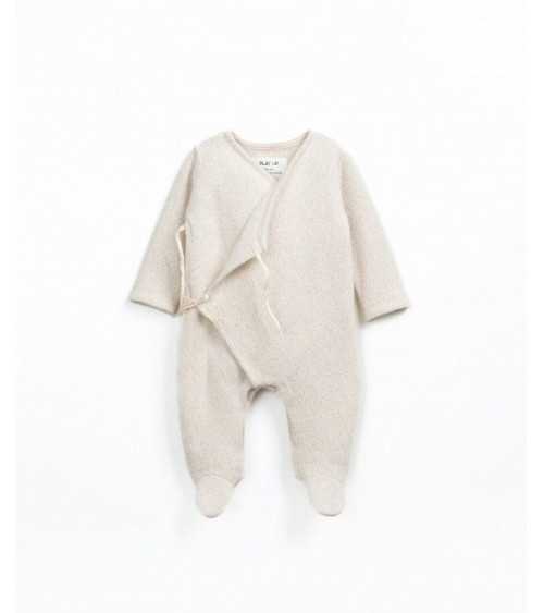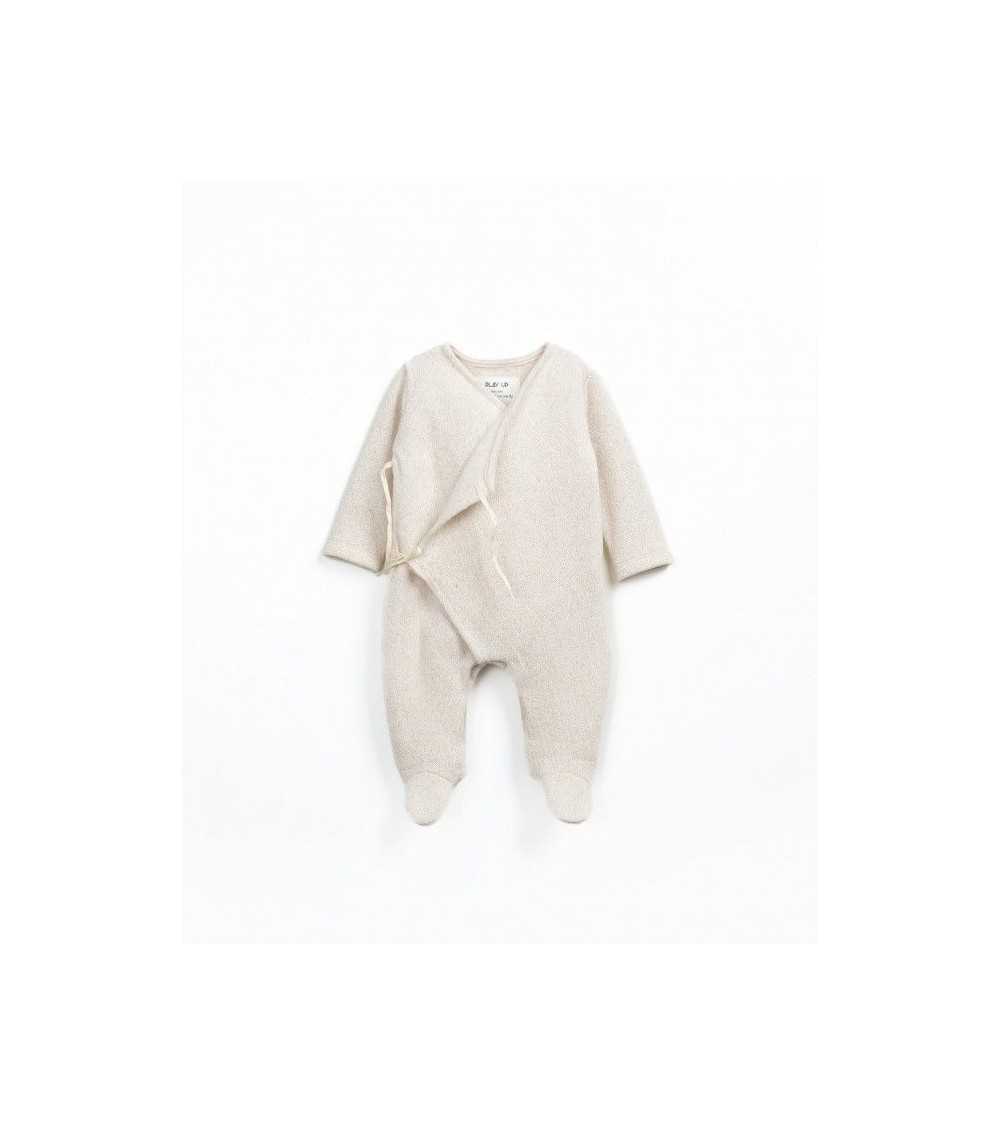 Mono Bebé en color Beige. Modelo de Mono Bebé Beige confeccioncado en punto con mezcla de algodón regenerativo y algodón orgánico. Este modelo de Mono Bebé tiene interior perchado, manga larga y pies integrados. El Mono Bebé Beige tiene abertura lateral cruzada con cierre exterior en lazo y presión interior, tiene abertura entrepiernas con broche libre de níquel.