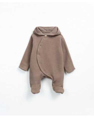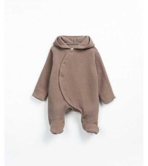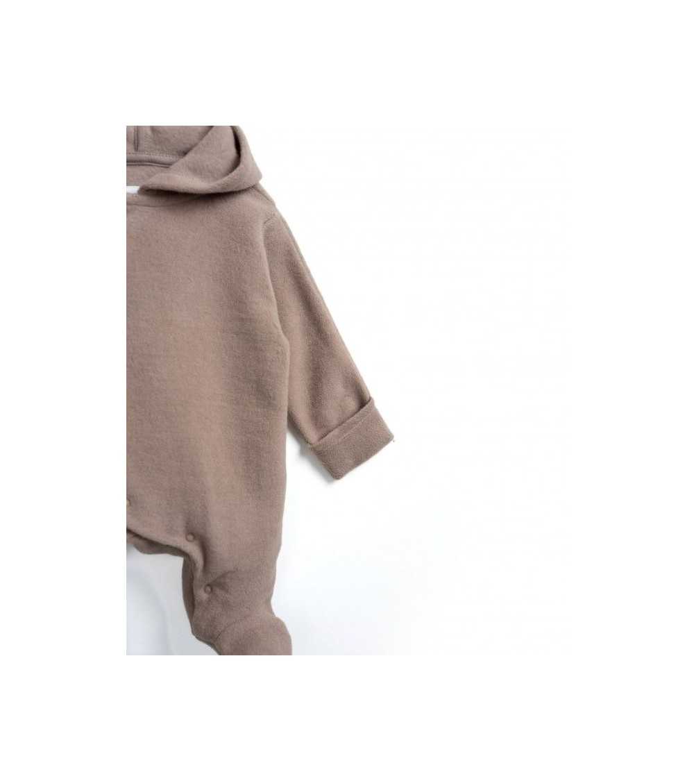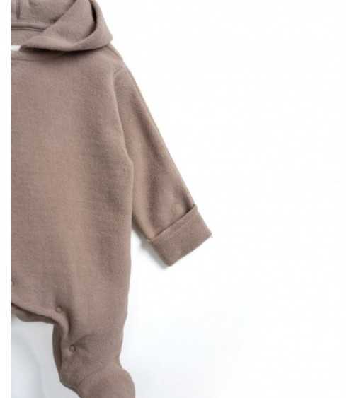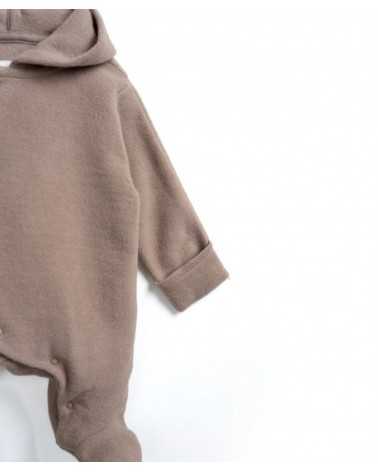 Mono Polar confeccionado en algofón orgánico en color Topo. Modelo de Mono Bebé Polar con capucha, anga larga y pie incorporado. Este Mono Bebé Polar tiene abertura frontal completa con cierre en corchetes libres de níquel y mangas ocn extremos reversibles para cubrir sus manitas.