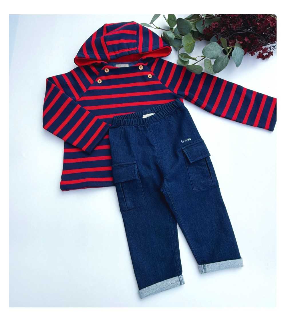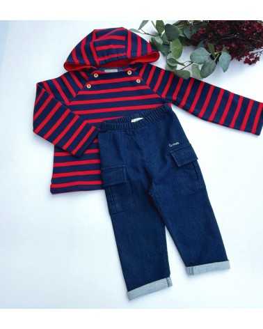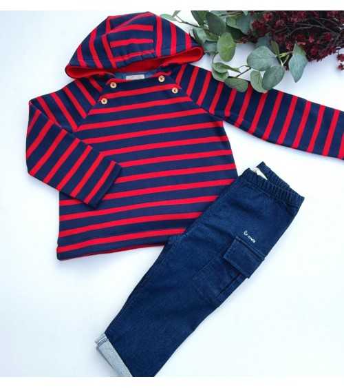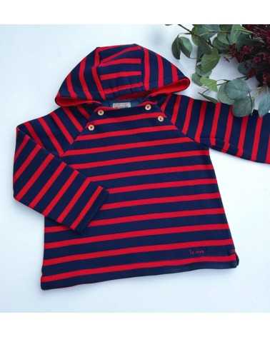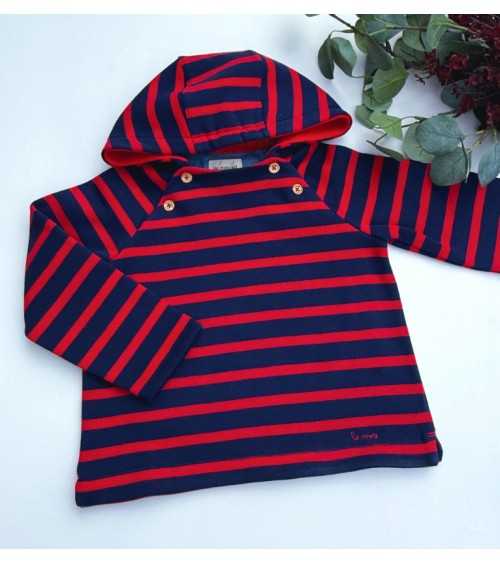 Sudadera Bebé en Rayas Marino y Roja. Esta modelo de Sudadera Rayas es de Capucha y manga larga. La Sudadera Rayas tiene aberturas en hombro con botones de madera para facilitar su puesta.