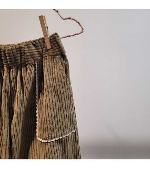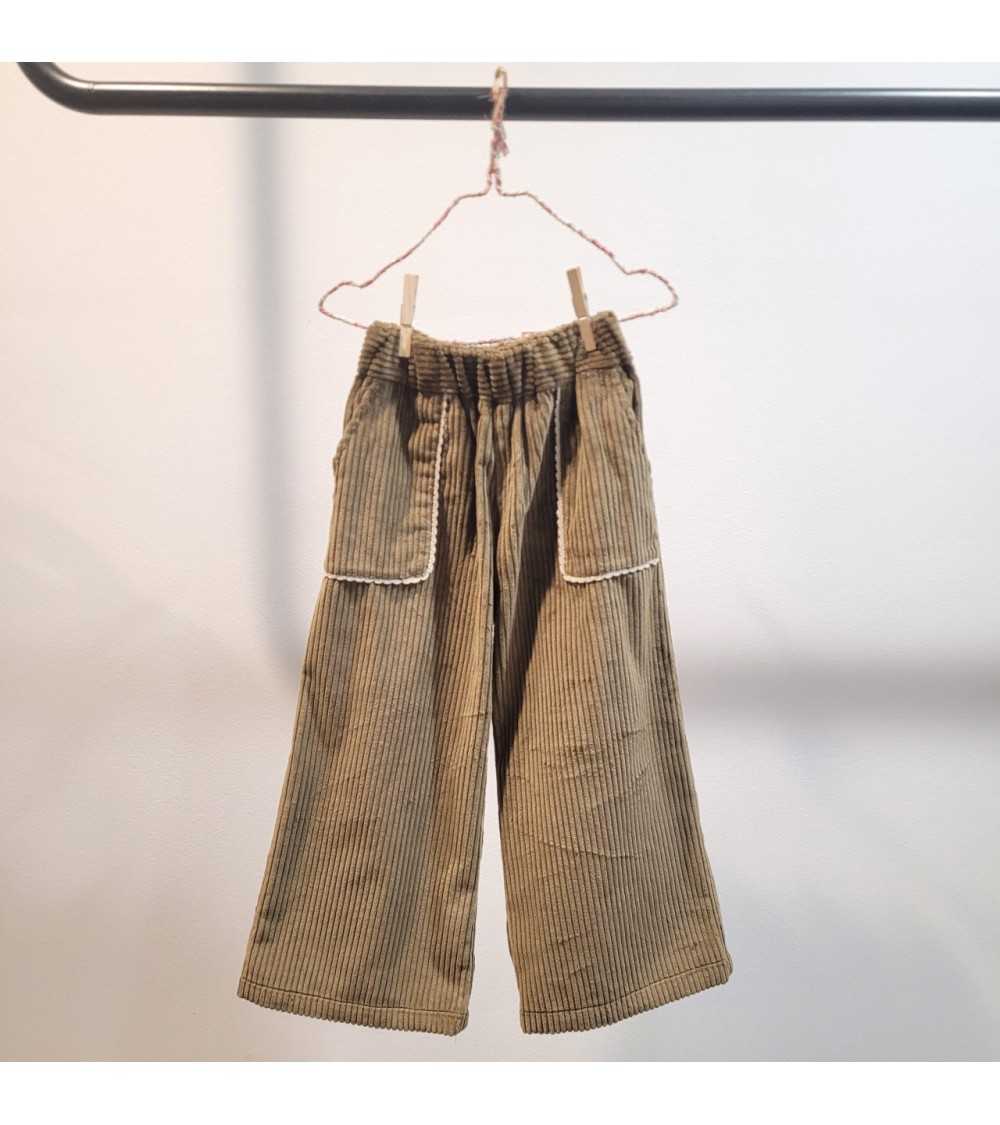 Pantalón en color Kaki de Mía y Lía. Modelo de Pantalón Kaki elaborado en Pana. El Pantalón Pana Kaki tiene cintura elástica y pierna ancha. Este modelo de Pantalón Pana Kaki tiene detalle a contraste en zona de bolsillo.