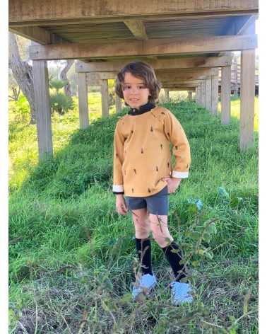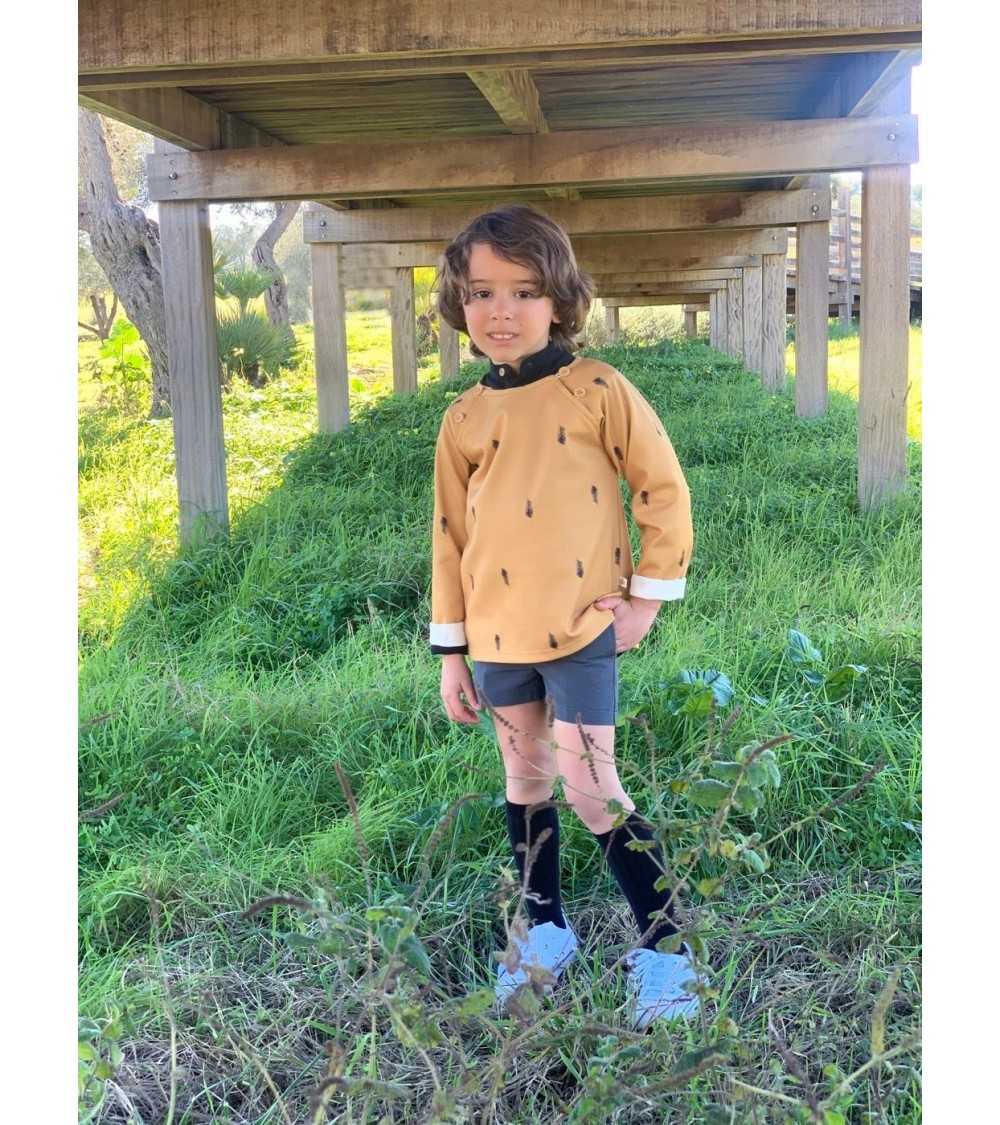 Sudadera Unisex en color Mostaza con Estampado en Plumas de color Negro. Este modelo de Sudadera Unisex de Plumas de manga larga tiene cuello redondo con dos aberturas laterales que cierran con dos botones en madera.