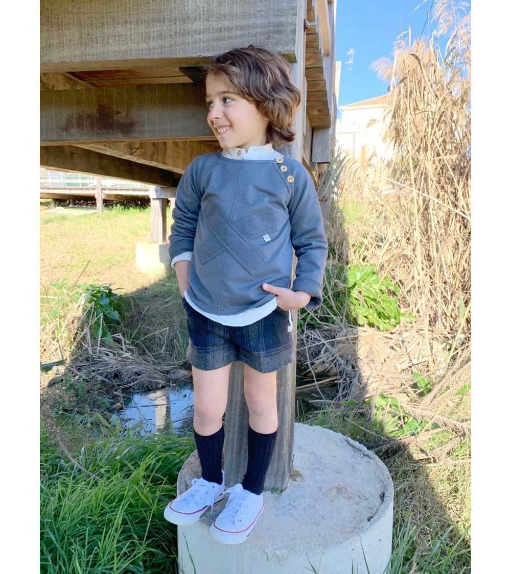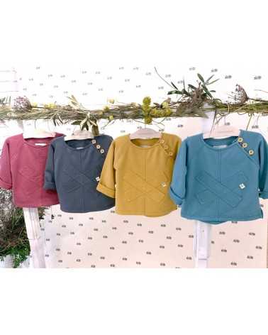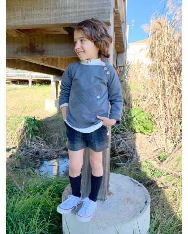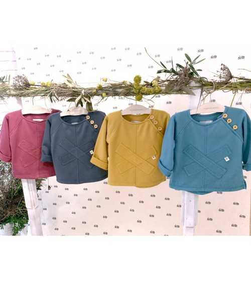 Sudadera disponible color Pacífico y Gris con Cruz en la parte delantera. Esta modelo de Sudadera de color Pacífico tiene cuello redondo y aberturas laterales con cierre con tres botones en madera.