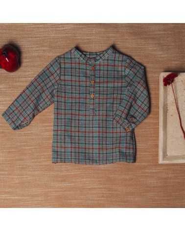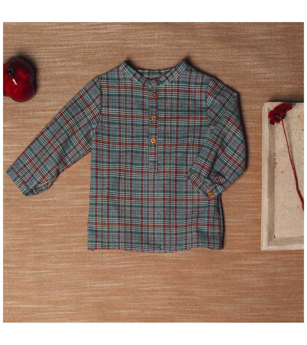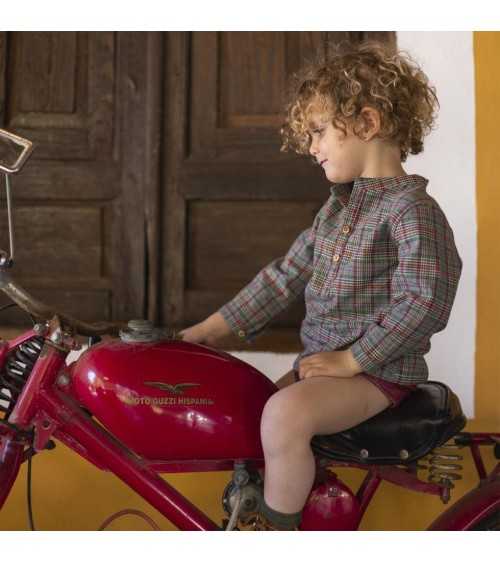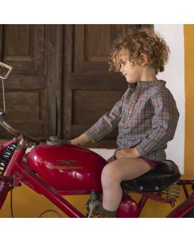Esta camisa polera de cuadros con fondo en gris y los cuadros en verde, rojo y naranja, consigue que el outfit de nuestros niños sea ideal para cualquier ocasión.