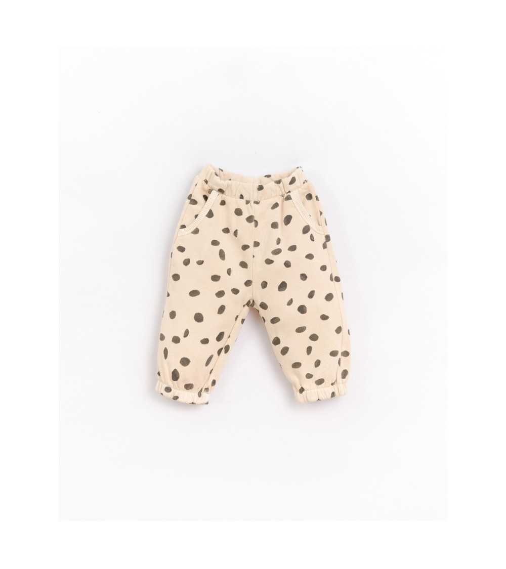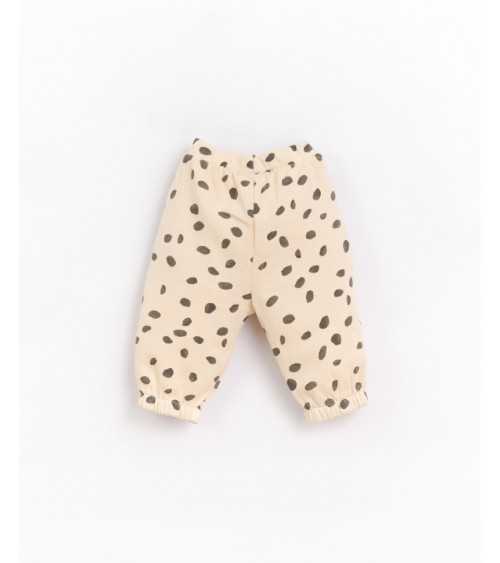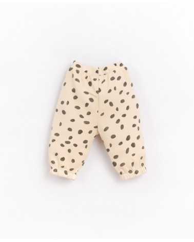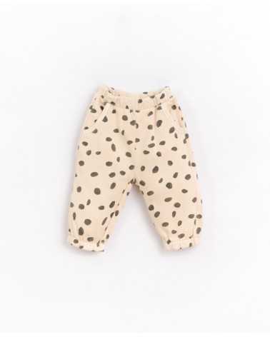 Pantalón con estampado de Topos. Modelo de Pantalón Topos largo está hecho con unamezcla de punto de Algodón Orgánico y Algodón. Es un Pantalón con bolsillos delanteros y cintura y puños elásticos. Este Pantalón Topos fue teñido con tintes naturales, libres de sustancias nocivas para la piel de los niñ@s y el medio ambiente.