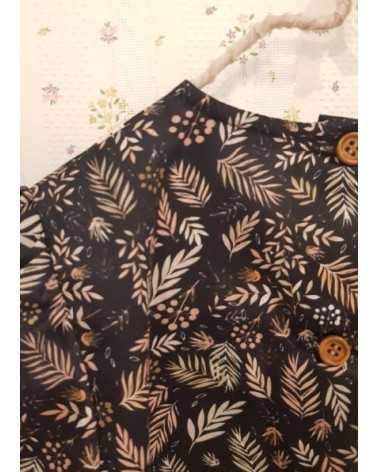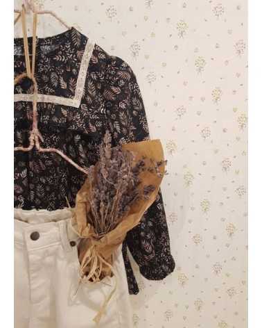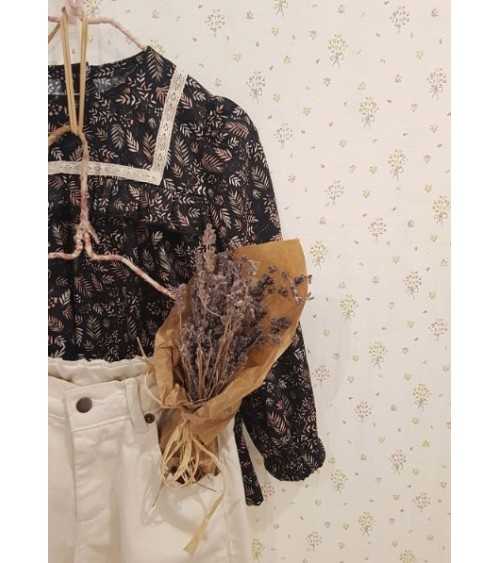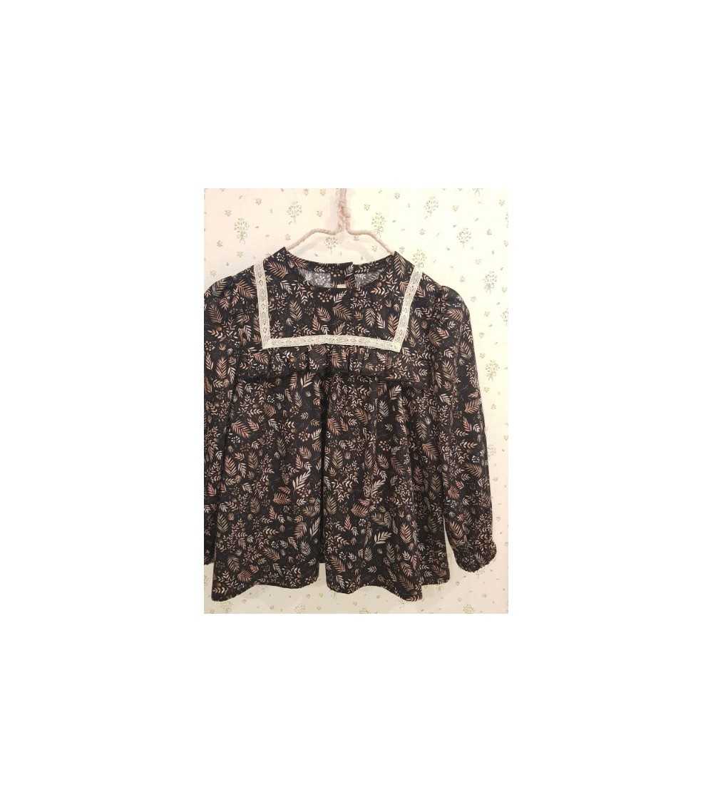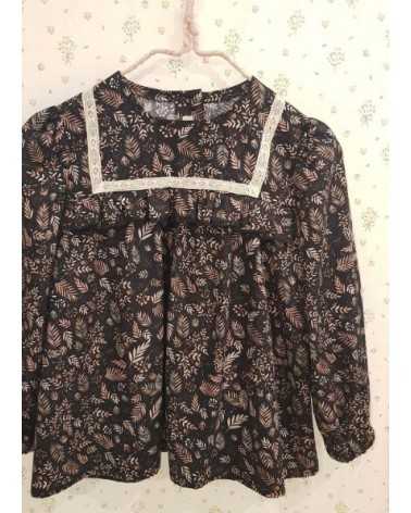 Blusa Negra con Estampado en Hojas. Modelo de Blusa Negra de manga larga abullonada en hombro. Esta Blusa Negra Hojas tiene un detalle de puntilla beige en pechera.