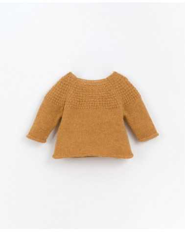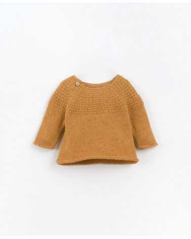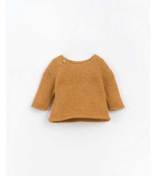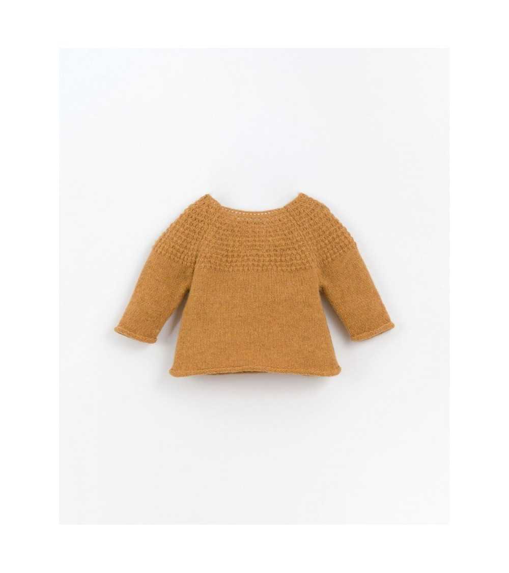 Jersey de Punto Tricotado en Color Mostaza. Modelo de Jersey Punto de cuello redondo con abertura en hombro con cierre en botón e coco.