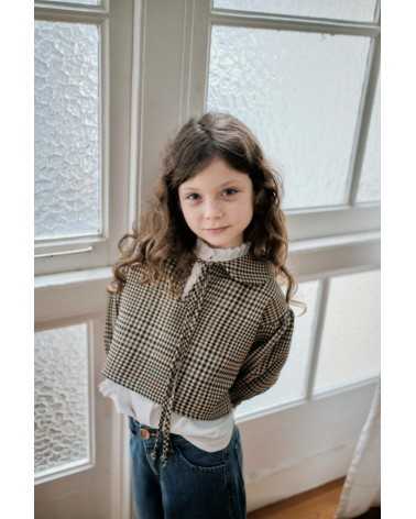Camisa Crop en tejido Pata de Gallo en Color Camel. Modelo de Camisa Crop de manga larga con puño en goma. Esta Camisa Crop Pata de Gallo tiene cuello bebé y una pequeña abertura en la zona de cuelo con cierre en cordón del mismo tejido.