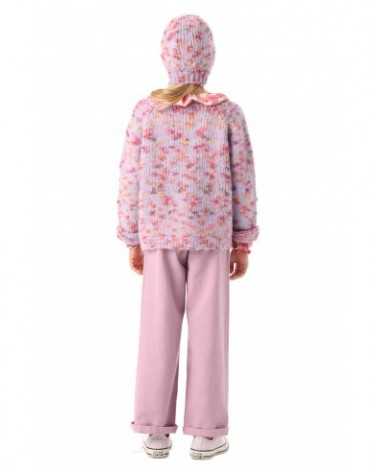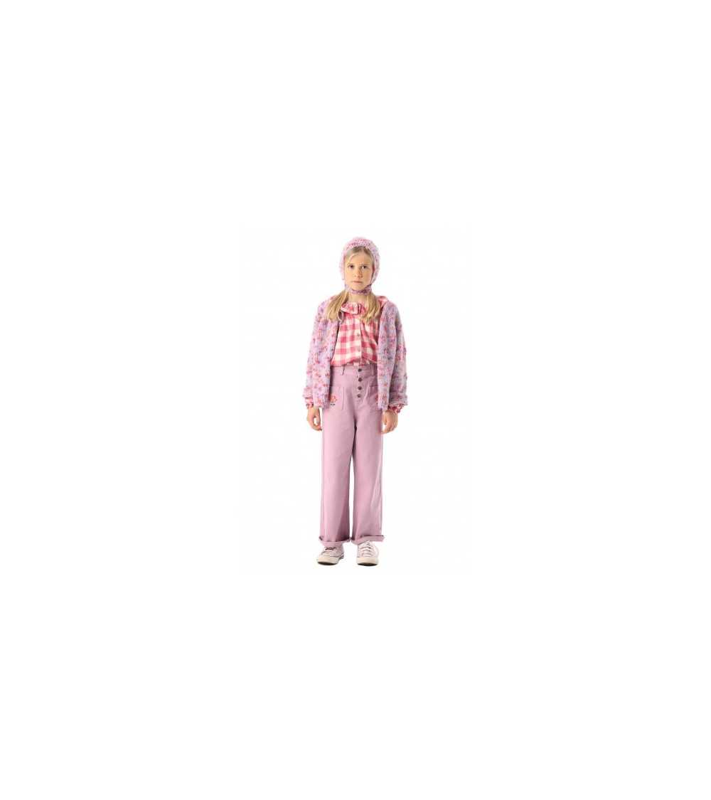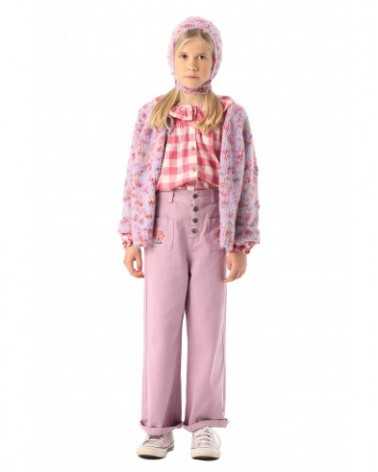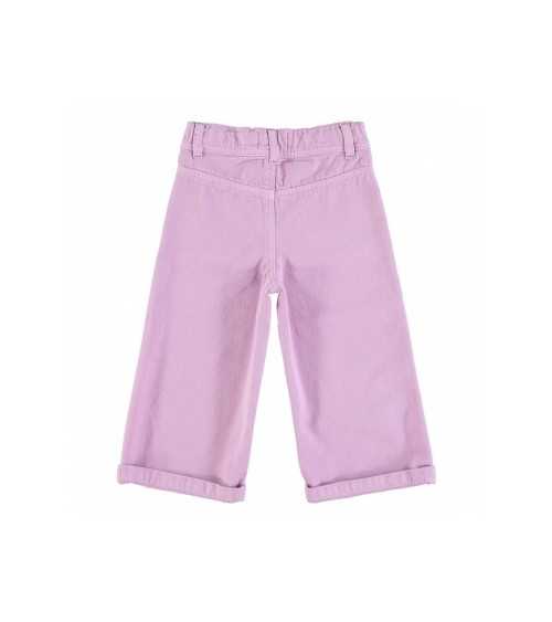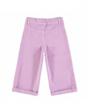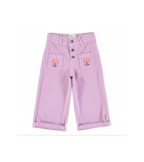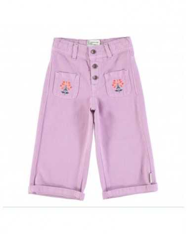 Pantalón de color Lila. Pantalón Lila de Campana con cintura ajustable. Este Pantalón Campana Lila tiene dos bolsillos delanteros con Flores Bordadas Multicolor.