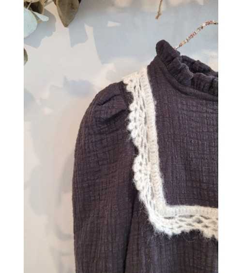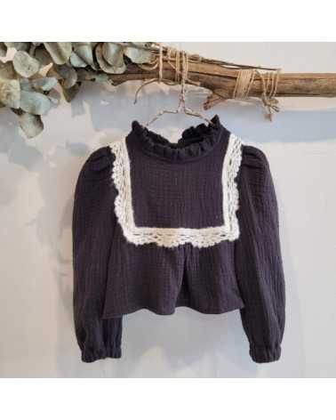 Blusa Crop en color Negro. Modelo de Blusa Crop Negro de manga larga y cuello medio subido en volante. La Blusa Crop Negra tiene detalle blanco en la pechera.