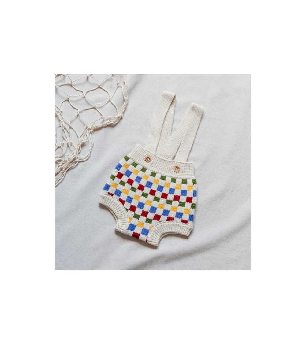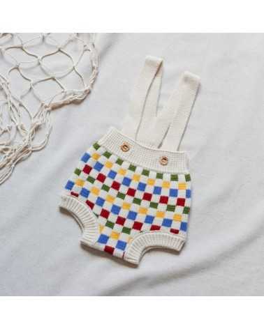 Culetín en Punto de color Crudo con Damero de Colores. Modelo de Culetin Damero con Tirantes cruzados en espalda. El Culetín Damera tiene abertura en entrepierna con cierre de botones.
