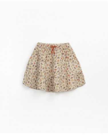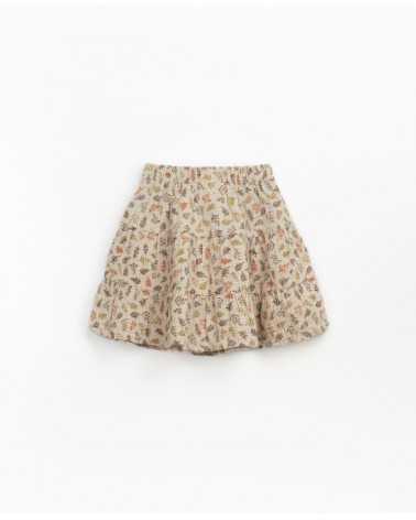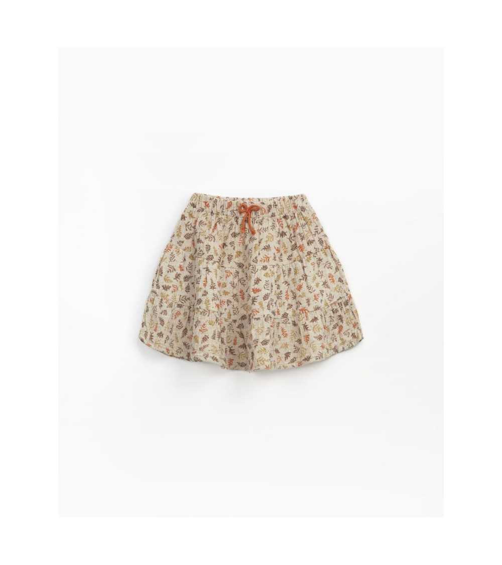 Falda con Estampado de Hojas en tonos tierra. Modelo de Falda Hojas confecciona da en tela de algodón orgánica. Esta Falda Estampado Hojas tiene cintura elástica y volante.