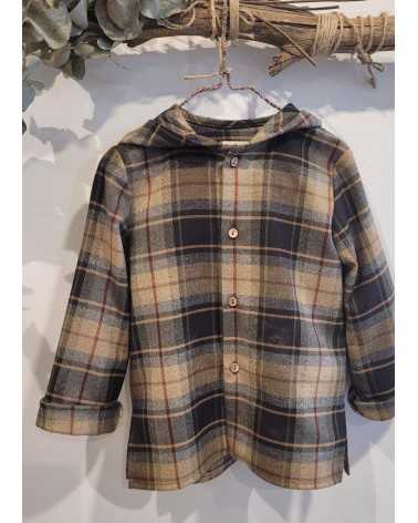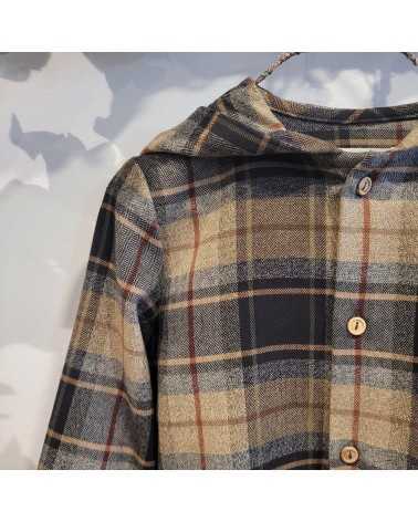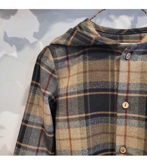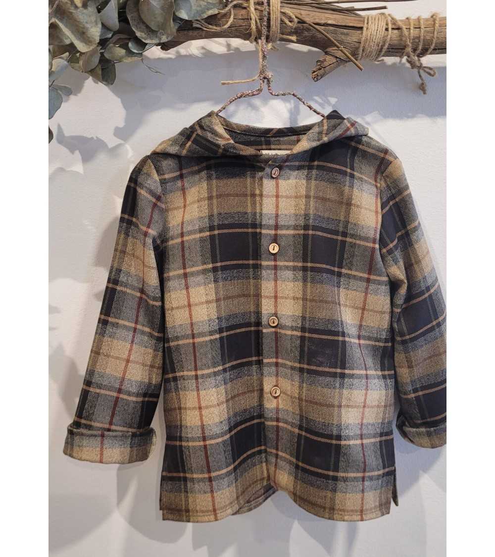Camisa Capucha en Cuadros de Color Camel y Azu. La Camisa Capucha Cuadros es de manga larga ya bertura delantera con cierre en botones de madera.