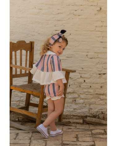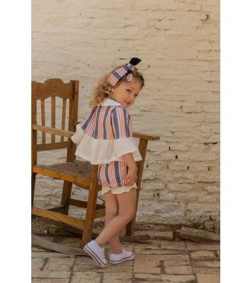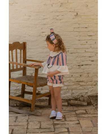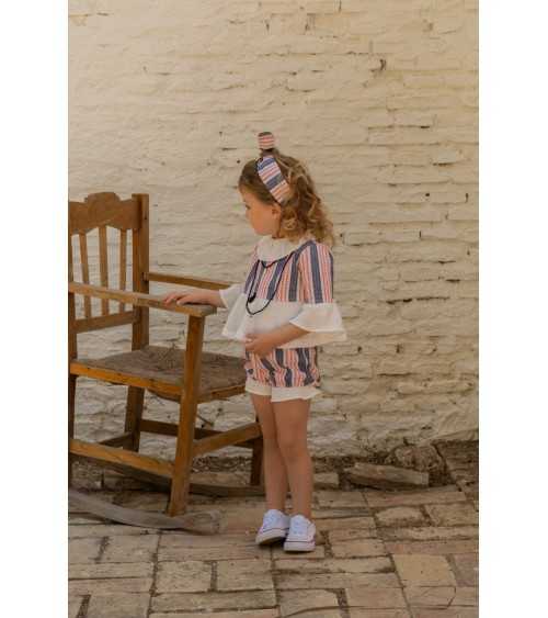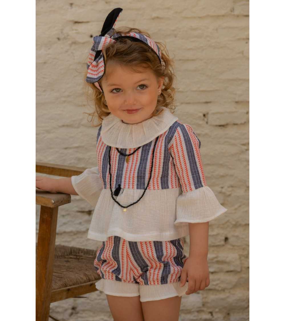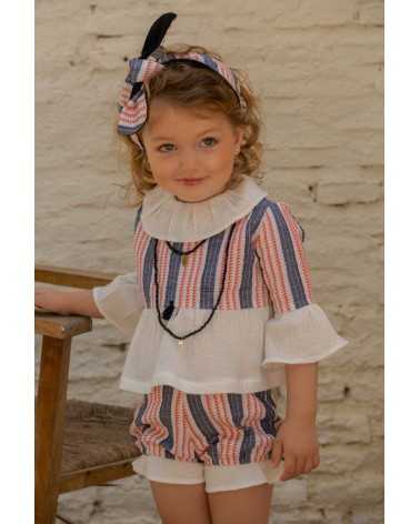 Conjunto dos piezas compuesto por braguita y blusón. Este Conjunto Barbados está confeccionado en tejido en tonos azules y naranja flúor combinado con bán¡mbula en color blanco. Modelo de Blusón en manga francesa y cuello redondo, la parte posterior y el cuello con de bámbula en blanco al igual que el cuello en volante, el cuerpo es de tejido haciendo dibujo en rayas azul, blanco y naranja flúor.