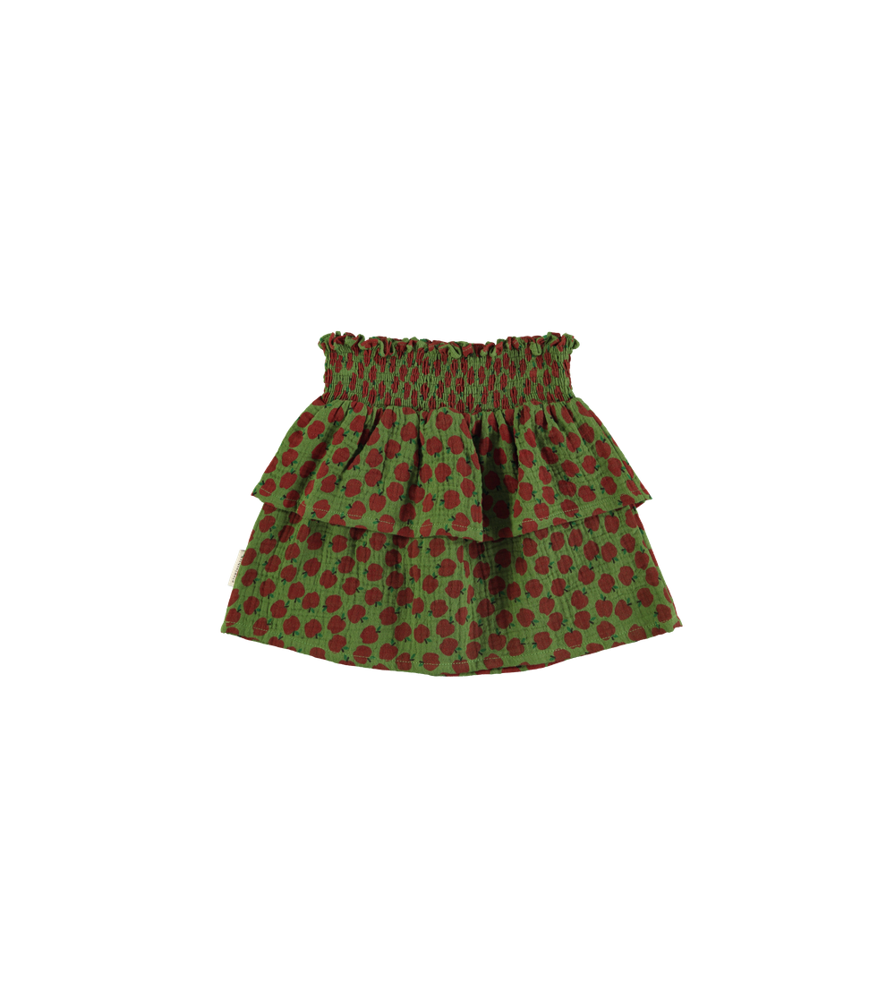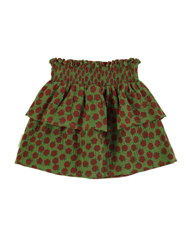 Falda en color Verde con estampado de Manzanas. Modelo de Falda Verde Manzanas corta de capas, con cintura elástica y dolble volante.