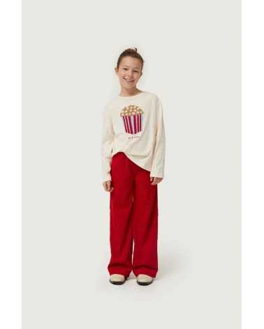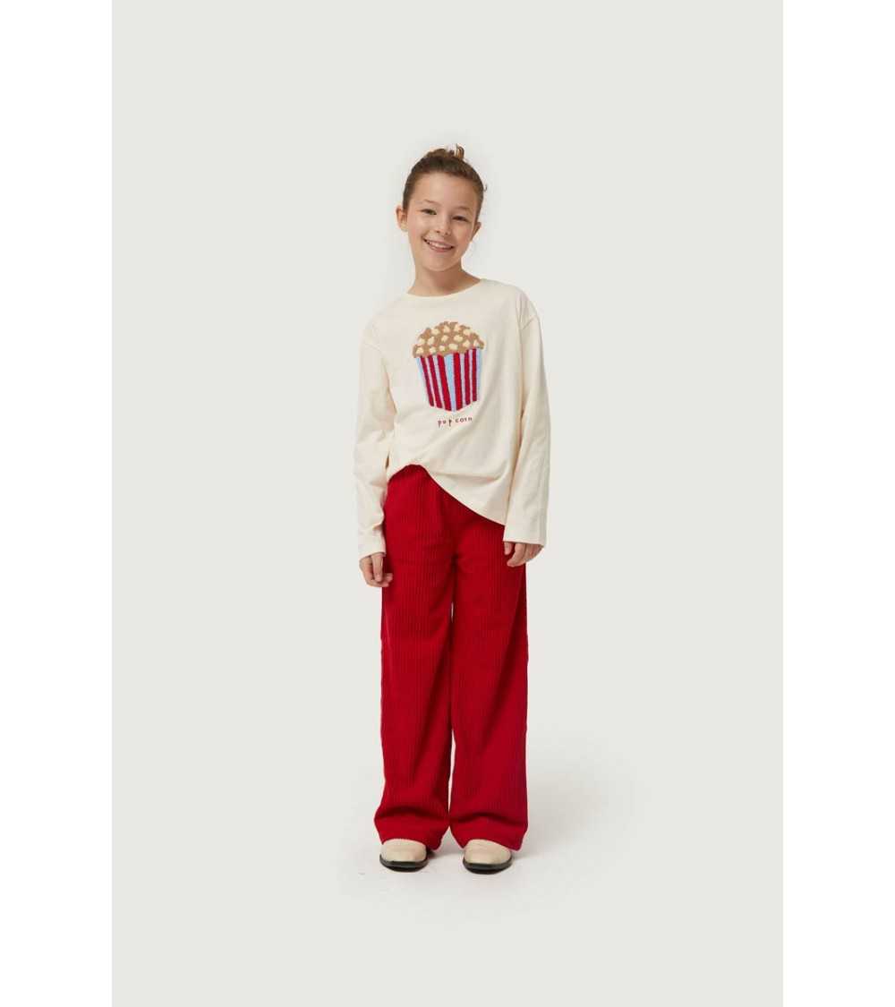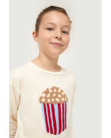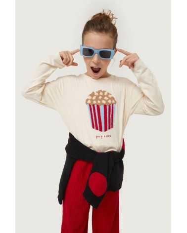 Camiseta  de color Crema con estampado gráfico de Palomitas con textura. Modelo de Camiseta Palomitas con cuello redondo y manga larga.