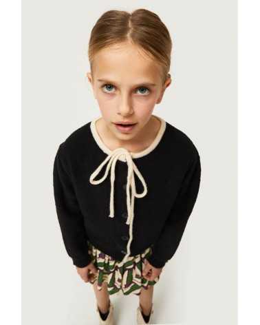 Cárdigan de niña de Punto en color Negro. Con cuello redondo y manga larga. Cierre frontal con botones. Detalle de Lazada en el cuello.