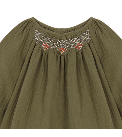 Vestido en color Verde Antique. Modelo de Vestido con Nidos en pecho y confeccionado en Bámbula. El Vestido Nidos Bámbula es de manga larga con puño en goma y largo por encima de la rodilla.