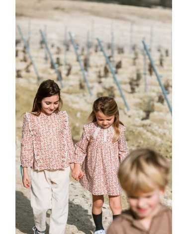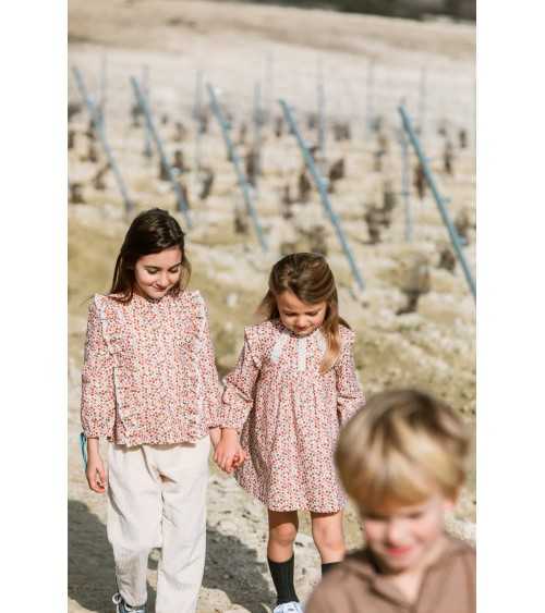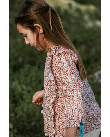 Blusa con estampado de Flor Multicolor. Modelo de Blusa Flor Multicolor de manga larga y cuello rdondo. La Blusa Flor Multicolor tiene abertura en espalda con botones de madera. Esta Blusa Flor Multicolor es un modelo clasico de Mía y Lía con los dos volantes en laterales de la parte delantera.
