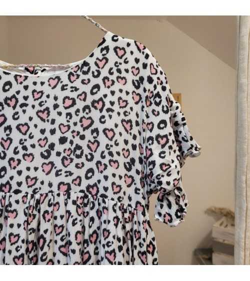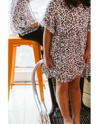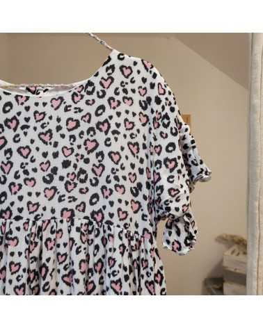 Vestido en estampado Print en color Rosa y Negro. Este Vestido Print es de corte over, cuello redondo y manga corta. El Vestido Print tiene volante en bajo y en terminación de mangas.
