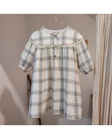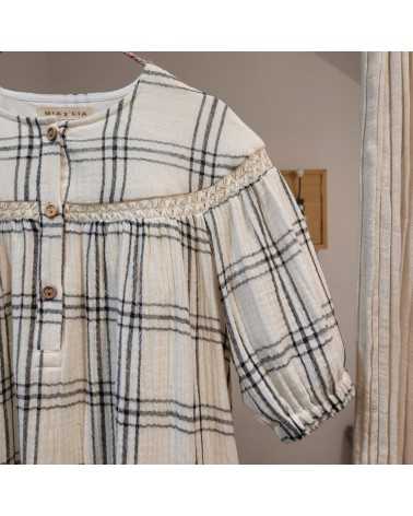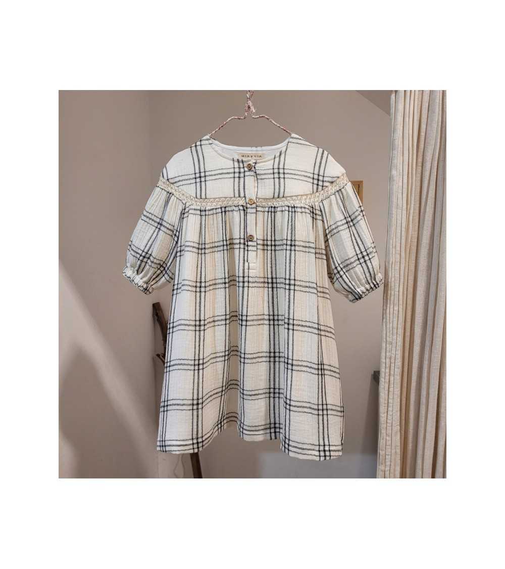 Vestido en estampado de Cuadros en color Beige y Negro. Modelo de Vestido Cuadro de cuello redondo con detalle en pecho. Este Vestido Cuadro Beige y Negro es de manga francesa.