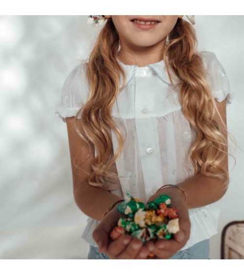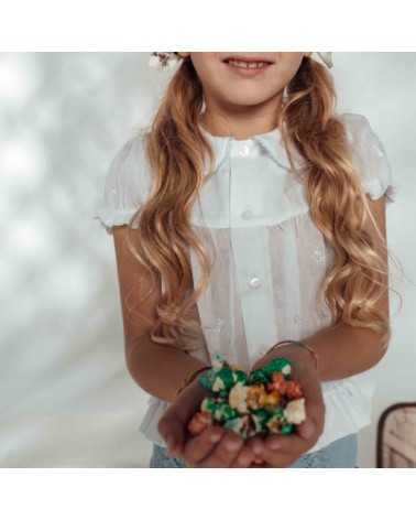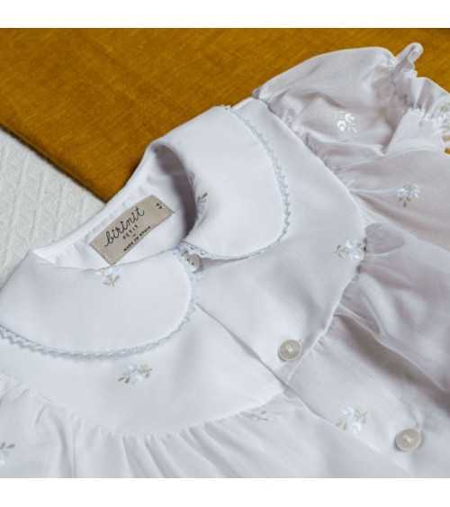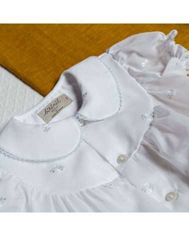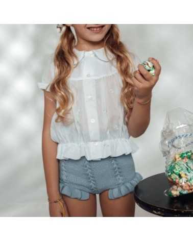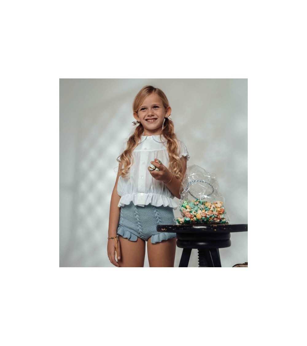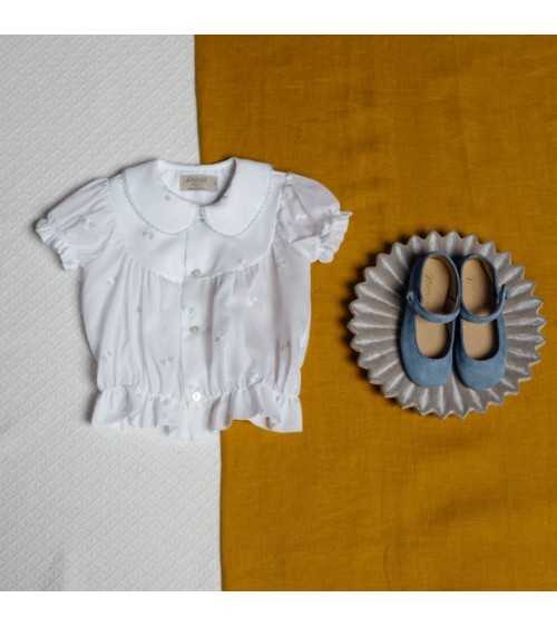 Camisa Flor en color Blanco. Modelo de Camisa Flor en manga corta y cuello bebé. Esta Camisa Flor tiene ajusta la parte baja con goma dejando caer una volanta natural con la misma tela.