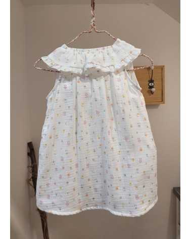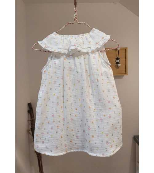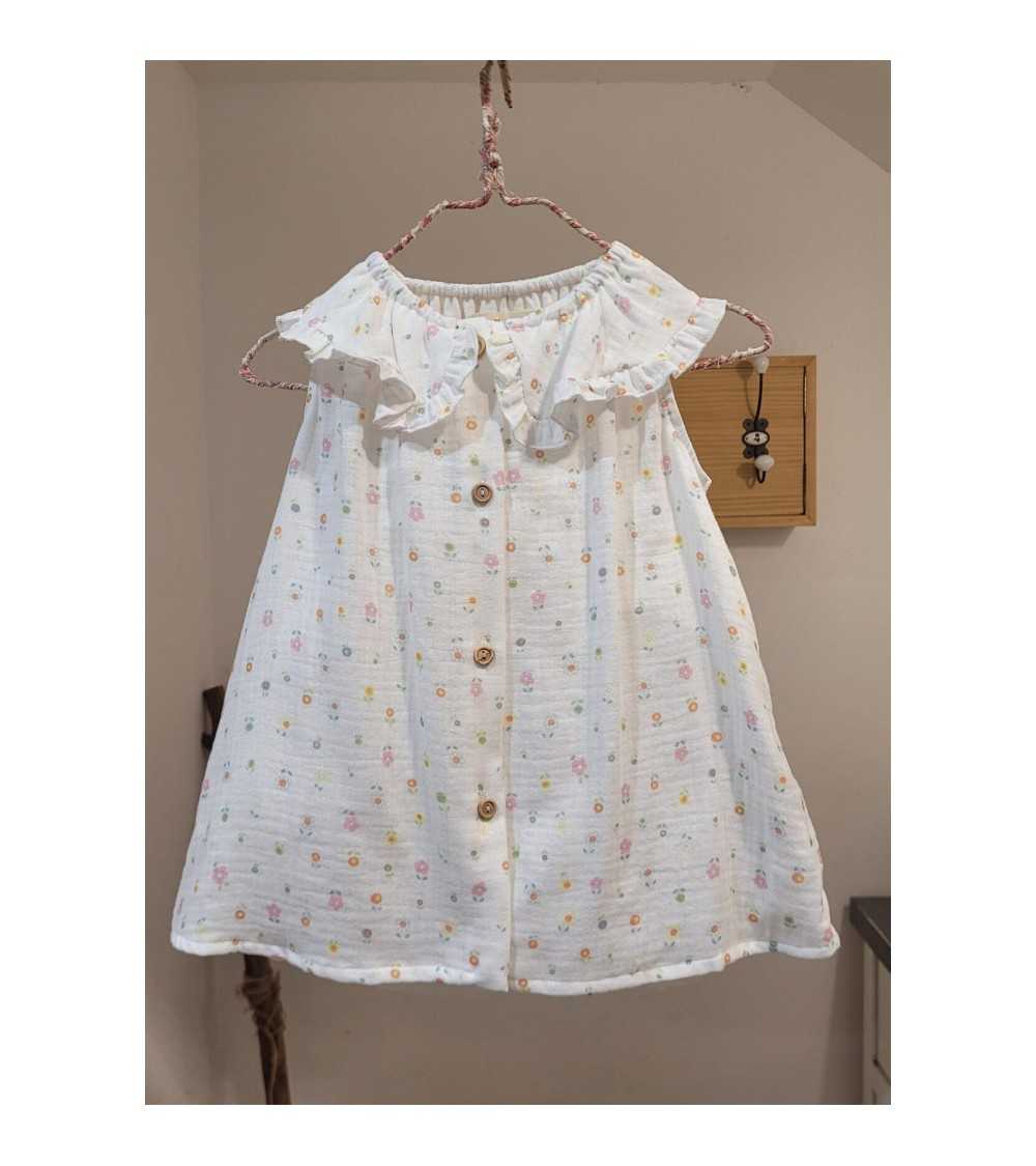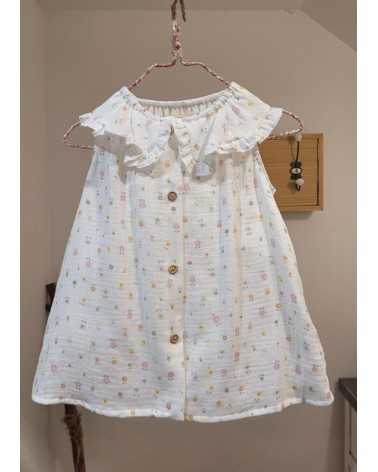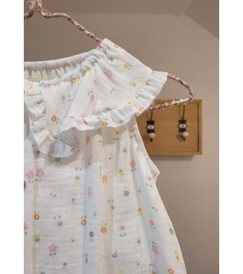 Blusa en color Blanco con etampado de Flores. La Blusa Flores está confeccionada en tejido Bámbula Blanco. Este modelo de Blusa Bámbula Flores tiene cuello bebé con rmante en colantito y es de manga sisa.