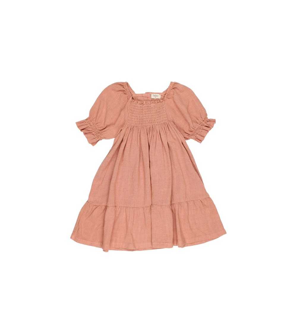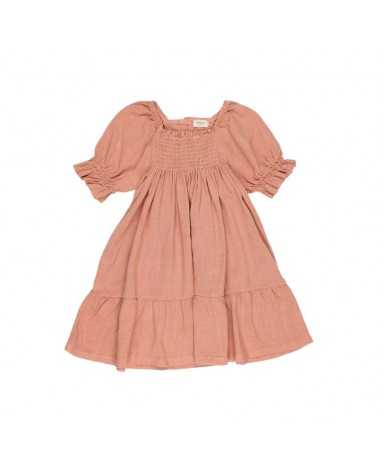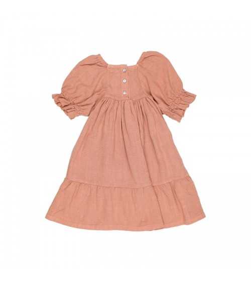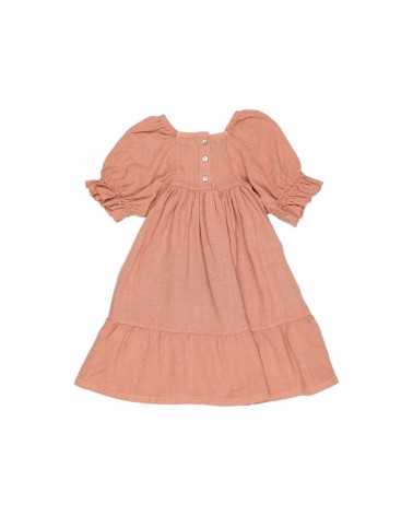 Vestido en color Nude. Modelo de Vestido Nude en tejido Fluído de viscosa de lino. Modelo de Vestido Nude Fluído de manga corta abullonada y escote cuadrado. Este Vestido Nude Fluido tiene gomas en cuello y nido de abeja en pecho.